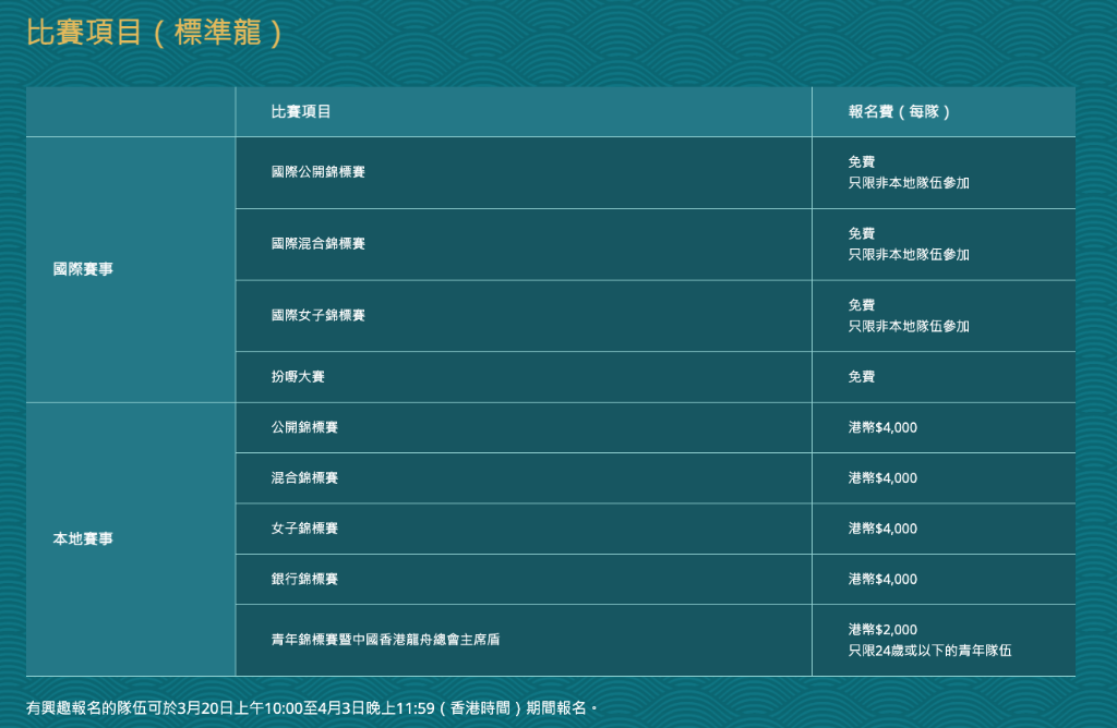 香港新聞網3月15日電 闊別4年的“香港國際龍舟邀請賽”即將回歸,香港旅遊發展局(旅發局)宣布,由旅發局及中國香港龍舟總會(龍總)合辦的“香港國際龍舟邀請賽”將於今年6月24至25日(星期六至日)在維多利亞港舉行,市民及旅客屆時可於尖沙咀東海濱至星光大道一帶欣賞連場激烈賽事。 旅發局表示,今年活動計劃邀請本地、內地、及海外各地的龍舟勁旅報名參賽,更首設獎金予四大賽事的勝出隊伍。各地精英即將雲集維港,市民旅客將可再一次體驗香港大型體育活動的魅力。根據中國香港龍舟總會公告,香港及海外龍舟隊的領隊可於3月20日上午10時起,至4月3日期間前往龍總網站報名(按此)。