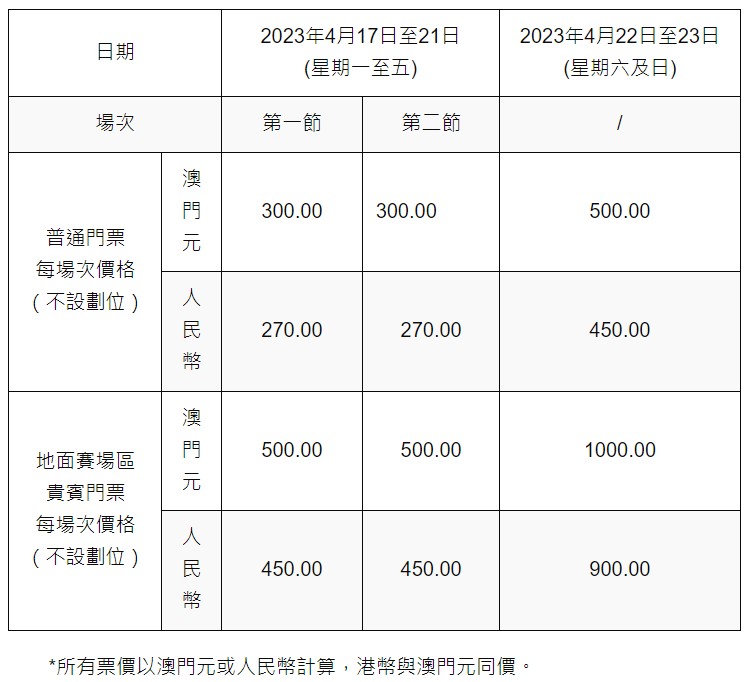 門票3月23日上午10時起公開發售 賽事日程方面,4月17日至21日每日賽事分為兩節,4月17日及18日第一節賽事由上午11時30分開始、第二節由晚上7時開始;4月19日及21日第一節賽事由下午1時開始、第二節由晚上7時開始;4月22日4強賽事由晚上7時開始,而4月23日的決賽由傍晚6時開始進行。賽事門票設普通門票及地面賽場區貴賓門票兩種,並將於3月23日上午10時起公開發售,市民及旅客可透過澳門售票網及電話預訂,或到廣星傳訊澳門及香港門市購買門票,或透過攜程旅行、Trip.com的手機應用程式及大麥購買、或於賽事期間到現場購買。每節賽事票價由300澳門元至1,000澳門元,價格視乎不同比賽日期及觀眾席而定,門票不設劃位,每人每場次限購最多4張門票。