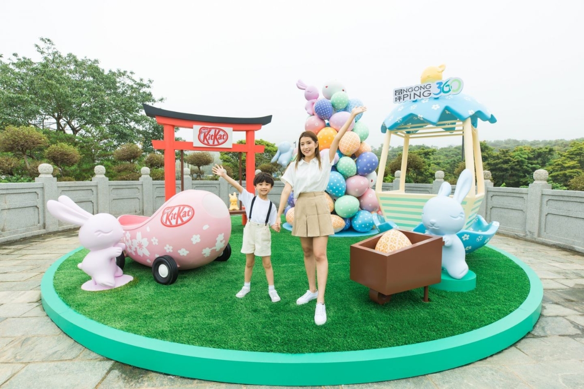 活動以朱古力為主題, 於昂坪市集圓形廣場設置由七彩繽紛的復活蛋砌成的3.5米高巨型彩蛋塔,活力十足的兔子攀上彩蛋塔大玩Egg Hunt,旁邊設有Kit Kat日式鳥居鞦韆,能輕鬆拍出充滿日系感覺的傳統鳥居照。