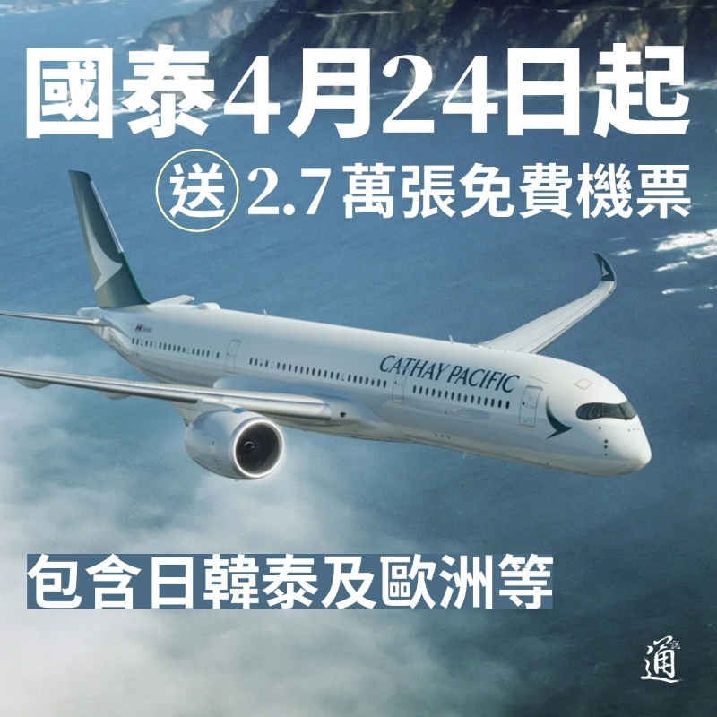 國泰4月24日至月底送2.7萬張免費機票 涵日韓新加坡等目的地分享到: