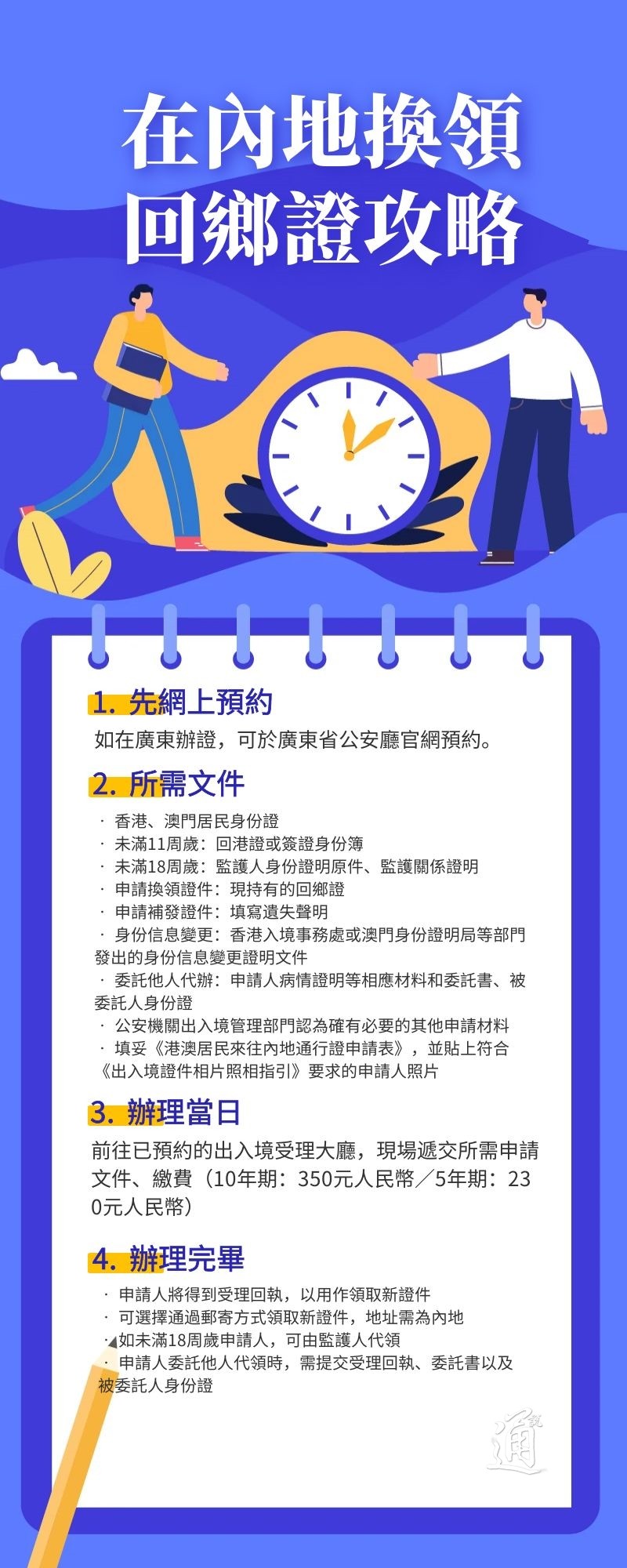 香港新聞網5月11日電  港澳居民來往內地通行證(俗稱回鄉證)續證預約持續爆滿,在香港要最快要排到9月。內地當局早前宣布,由5月8日起,延長2020年至今年底到期回鄉證的有效期至今年年底。市民入境內地後,可前往就近的縣級以上公安機關,申請換發補發回鄉證,手續與在港澳地區一致。辦理完畢並領取回執後,一般等待7個工作日, 便可領取新的證件。以下是內地換發補發回鄉證流程:
