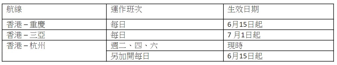 香港航空恢復每日前往重慶及三亞的航班。