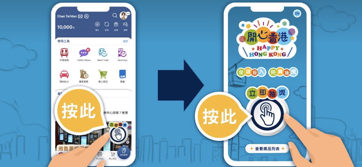 香港新聞網6月13日電 為響應“開心香港”活動,港鐵MTR Mobile今日(13日)起一連30日推出“一撳即獎”,每日送5,000份獎品,包括全年免費車票、車程優惠、購物禮券及昂坪360纜車門票等! 今日起至7月12日,MTR Mobile的登記用戶只需於早上9時至傍晚6點登入應用程式,再按“立即抽獎”的按鈕,免費參加抽獎。每名用戶每日可以抽獎一次,整個抽獎期內,最多可獲一次獎賞;若中獎,抽獎頁面會即時公布得獎結果,記得參加喇!