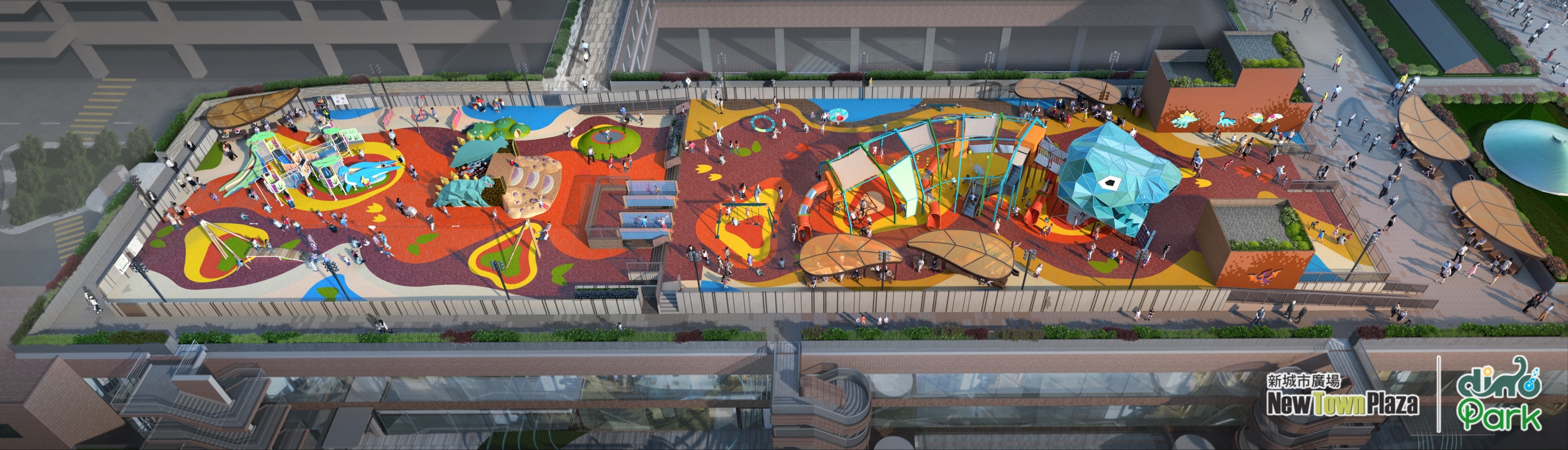 新城市廣場恐龍公園日景。 新城市廣場恐龍公園 Dino Park參考美國兒科醫學會對小孩喜愛恐龍原因作樂園的設計概念,藉著園區的色彩度、設施的可探索程度及造型的真實程度,讓兒童於玩樂中認識自己,發掘自我潛能、鍛鍊對外界觸感的靈敏度及四肢協調及平衡。