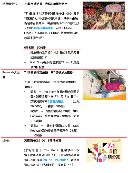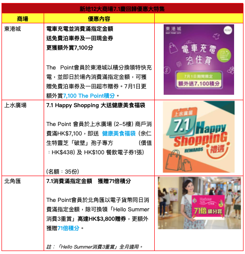 香港新聞網6月23日電 為慶祝香港回歸26周年及特區政府成立紀念日,政府宣佈聯同公營機構推出多項優惠及免費活動,讓大家開心共慶回歸。新地12大商場(東港城、上水廣場、北角匯、將軍澳中心、PopWalk天晉滙、Mikiki、屯門卓爾廣場、屯門錦薈坊、荃錦中心、新領域廣場、life@KCC及joy@KCC)亦響應號召,聯同旗下商戶以“七一”為主題,於7月1日當天在港九新界12大商場推出七大震撼優惠,只需即日消費滿指定金額,即大送優惠禮券及額外積分,讓市民一齊開心慶祝!為延續歡樂氣氛,部分優惠提案更擴展至全月供應,冀與民同樂!新地十二大商場預料,受惠於市面喜慶氣氛,加上正值暑期檔期,今年七一周末人流及營業額將分別錄得按年20%及25%升幅。 新地十二大商場聯同旗下商戶聯手,合力推出“七一”為主題的多項優惠,當中包括: 東港城︰7.1 電車充電並消費滿指定金額,送免費泊車券及一田現金券,更獲額外賞7,100分 上水廣場︰7.1 Happy Shopping消費滿HK$7,100,大送健康美食福袋 北角匯、荃錦中心及新領域廣場︰7.1消費滿指定金額,獲贈71倍積 將軍澳中心︰7.1消費滿HK$1,000,即送HK$70禮券組合 PopWalk天晉滙︰7.1在場內消費金額內含“7”及“1”數字,該單消費可享5倍會員積分! PopWalk天晉滙︰7.1餐飲消費滿$710,獎賞HK$100 PopWalk 綜合購物或滋味美食電子優惠券 Mikiki、卓爾廣場、錦薈坊︰7.1消費滿HK$7100,即享5倍積分