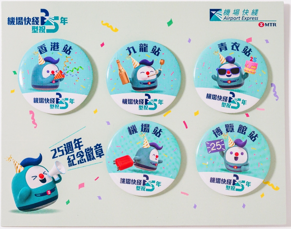 機場快綫為慶祝25周年,推出紀念徽章。(圖片:港鐵公司) 港鐵香港客運服務總監楊美珍表示,為答謝乘客支持,港鐵會在今個月透過手機應用程式,合共送出7.5萬張機場快線單程車票,總值超過800萬元,還推出25周年主題列車、歌手演唱、機場快綫大使“機鐵仔”快閃派發紀念品等慶祝活動,讓市民同慶機場快線生辰。 【編輯:黃璇】