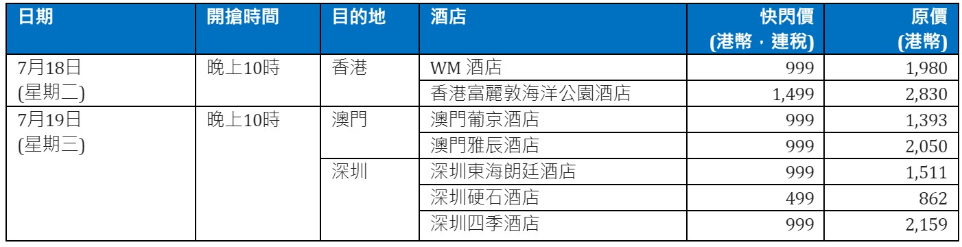 限量台北機票買一送一優惠 Trip.com首度與大灣區航空合作,推出香港至台北往返機票買一送一優惠。Trip.com用戶記得於7月16及17日晚上10時,留意“Trip.com獨家大灣區航空買1送1”標籤以進行競搶,成功後即可免費獲得一張相同的來回台北機票 (僅限成人票)。成功搶得的台北機票的用戶可於2023年12月31日之前成行,以人均HK$800起超值優惠快閃台灣。 限量港、澳、大灣區酒店優惠:連稅低至HK$499 Trip.com另精選多間熱門港、澳、大灣區酒店優惠進行限量競搶,適合計劃周末旅行的用戶。由7月18日至20日每晚10時均有不同的酒店提供快閃優惠予Trip.com用戶競搶。優惠包括以低價(連稅,下同)HK$999入住香港WM酒店,以HK$999入住澳門葡京酒店,以及以HK$499入住深圳硬石酒店等。名額有限,先訂先得,售完即按照原價售賣。