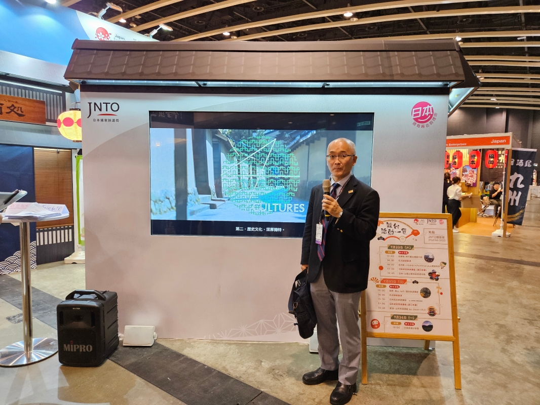 日本國家旅遊局香港事務所所長小沼英悟表示,JNTO此次安排了多項舞台活動。(香港中通社記者 黃璇攝)