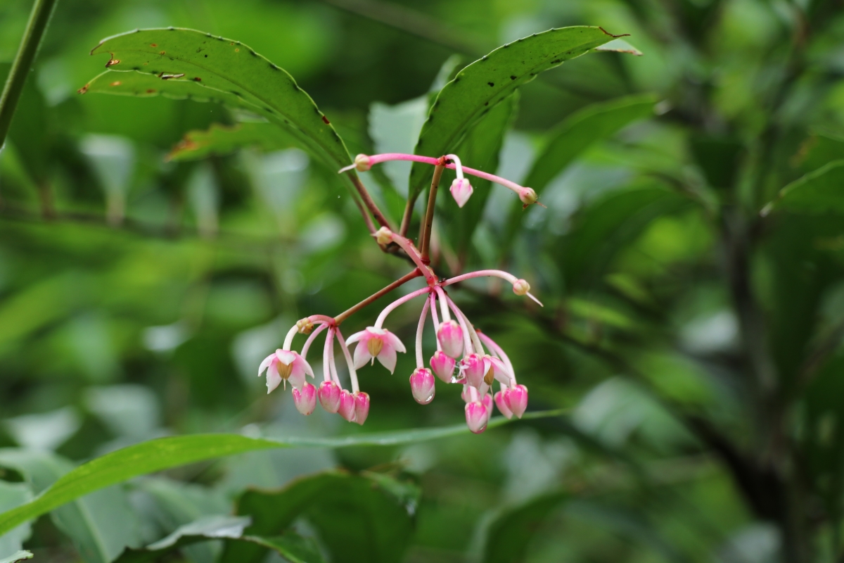 郎傘樹,亦稱大羅傘樹。 至於在下山區盛開的“朗傘樹”(Ardisia Hanceana,亦稱“大羅傘樹”),是報春花科紫金牛屬植物,有時卻被誤認作吊鐘花。走近觀賞,會看到帶紫桃紅色的花呈複傘房狀繖形,到末端會變尖,感覺更顯含羞答答;亦一如其名,如像大雨時撐起的“傘”,充滿詩情畫意。