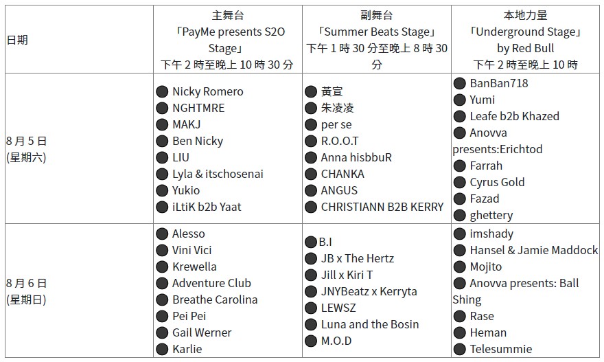 S2O音樂節設濕身區及非噴水區。(圖片:S2O) 雲集世界知名DJ、音樂人 主辦單位宣佈首輪演出單位名單,陣容十分強大!除了有壓軸登場的“瑞典電音王子”Alesso、世界級DJ如Ben Nicky、Krewella、Liu,更有本地、海外 DJ、藝人及本地音樂人參與!如per se、JB x The Hertz、韓國音樂才子B.I金韓彬等都加入參與。