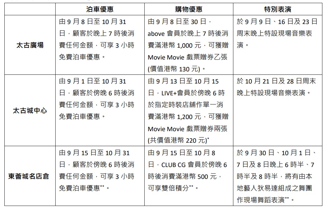 太古地產旗下商場推出的優惠詳情。 【編輯:黃璇】