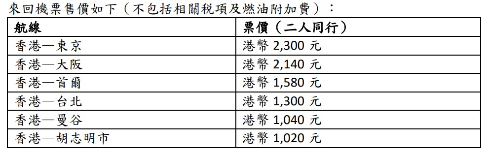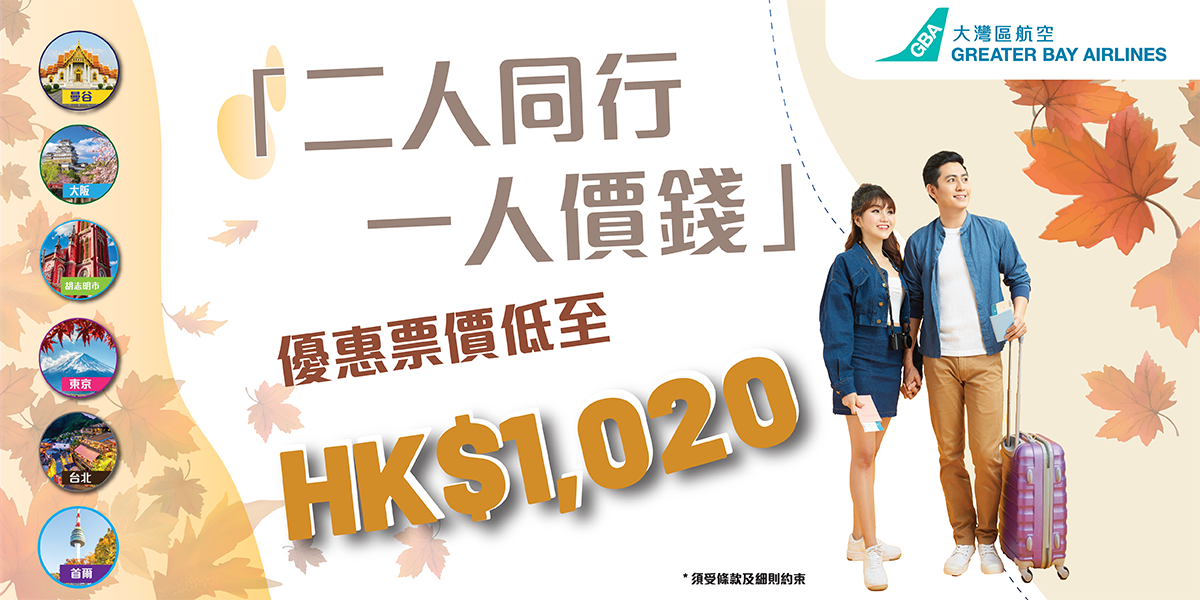 大灣區航空今起(9月19日)推出“二人同行 一人價錢”優惠。 此項優惠適用於2023年9月18日至28日、2023年10月1日至19日及2023年10月22日至12月15日期間,從香港出發前往東京、大阪、首爾、台北、曼谷或胡志明市的大灣區航空航線。每程停留日數最多為7天。 票價已包括每程7公斤手提行李及10公斤託運行李限額,以滿足旅客購物所需。乘客如有需要,亦可另外購買託運行李限額。