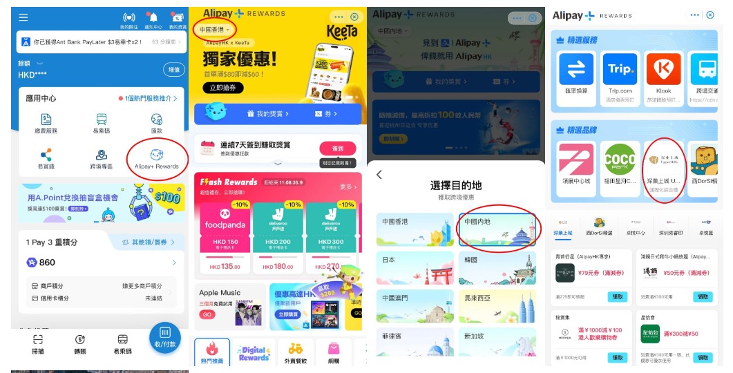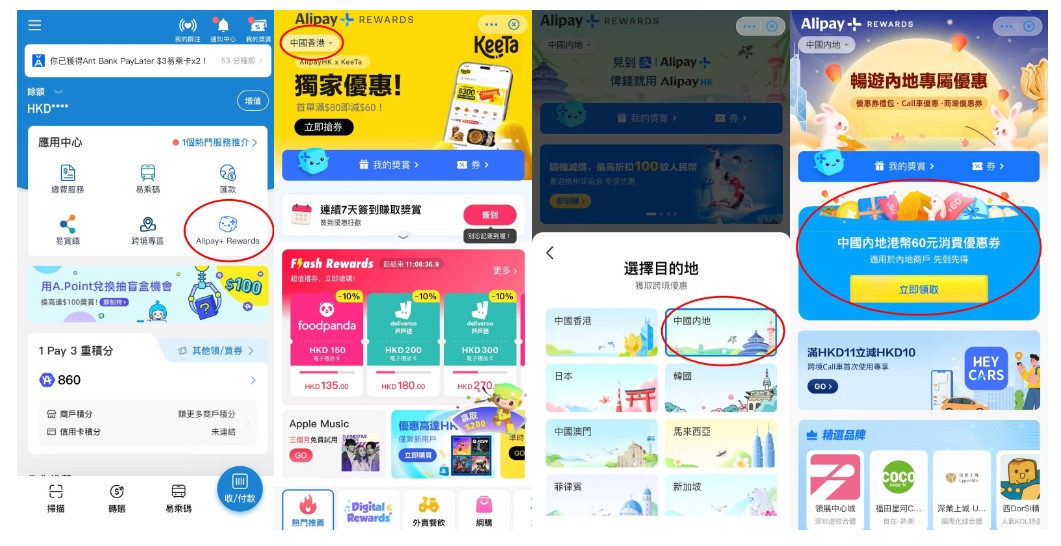 AlipayHK深圳消費連環賞 推出港人專享優惠香港新聞網9月27日電 自從開關後,深圳吃喝玩樂日漸成為港人周末日常活動之一,要在內地暢通無阻的話,電子錢包必不可少,AlipayHK現已在內地通用,無論是大小商店消費付款,或乘公共交通工具如深圳地鐵、call車,都可以免手續費輕鬆付款,無需重複進行身份認證。臨近十一國慶,AlipayHK密鑼緊鼓推出多個節日限定活動,9月底率先向每位用戶大派港幣60元優惠券,同時聯同深圳12間大型商場為用戶送上一系列港人專享優惠!當中包括深業上城UpperHills網紅食肆淺鍋及青苔行星折扣優惠、領展中心城人氣日式放題極上萬膳現金優惠券等。與分享北上玩樂攻略網紅西DorSi合作的“西DorSi精選”專區更有多個深圳特色主題活動優惠,包括teamLab入場優惠及馬術騎乘75折優惠等,透過AlipayHK App內小程式“跨境Call車”更可於內地call車兼付車資,輕鬆盡享深圳購物玩樂體驗! 1. AlipayHK香港用戶港幣60元優惠券 作為港人北上消費的主要手機支付工具之一,AlipayHK已覆蓋內地城市數以千萬計的商戶,包括便利店、超級市場、食肆酒樓、茶飲店等,用戶無需額外進行登記或重複進行身份認證,即可享“港幣付款 免手續費 享優惠匯率”消費體驗。今次AlipayHK趁十一國慶假期,特別推出高達港幣60元的電子優惠券,新舊用戶均可領取,消費更可即時賺取A. Point積分! 領取方法:進入AlipayHK主頁,點擊“Alipay+ Rewards”,目的地選擇“中國內地”進入專頁領取優惠券。