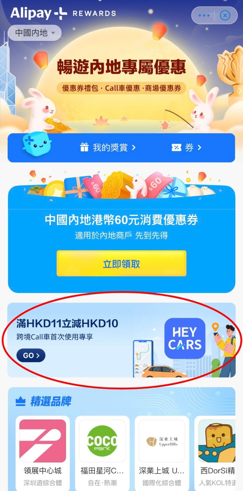 4. 乘車優惠 交通方面,AlipayHK內提供的服務更涵蓋內地公共交通乘車碼包括深圳地鐵,及當地call車服務,切合用戶不同用車需求,輕鬆暢遊深圳無難度!透過 AlipayHK App 內小程式“跨境Call車”於內地call車兼付車資,首次使用即享港幣10元優惠。 領取方法:進入AlipayHK主頁,點擊“Alipay+ Rewards”,目的地選擇“中國內地”進入專頁領取優惠券。