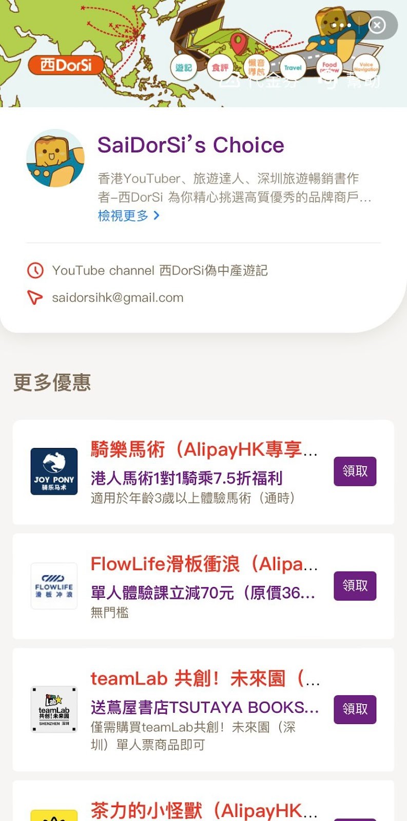 3. 特色活動精選優惠 商場之外,AlipayHK亦為用戶帶來多個特色主題活動優惠,“西DorSi 精選”專區為用戶搜羅多個精選優惠,包括$158購買深圳teamLab入場券贈送$39蔦屋書店TSUTAYA BOOKSTORE咖啡券一張、$188北村韓食活烤鰻雙人套餐 、Joy Pony騎樂馬術1對1騎乘75折優惠等,讓你與親友好友一同到深圳盡情玩樂狂歡。 領取方法:進入AlipayHK主頁,點擊“Alipay+ Rewards”,目的地選擇“中國內地”,再點擊“西DorSi精選”專區,即可找到多個深圳特色主題活動優惠。