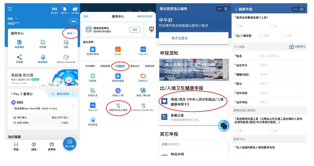 5. AlipayHK內地付款教學 只要連結香港信用卡或銀行賬戶到 AlipayHK,或完成身份認證以使用賬戶餘額,即可於內地使用AlipayHK進行購物消費。無論是展示 AlipayHK 付款二維碼給商戶掃描,或用 AlipayHK掃描商戶的收款碼,亦會根據即時匯率計算後以港幣結算,而且無手續費。付款流程與香港本地付款無異,只要在內地見到“支付寶”或“Alipay+”標識即可使用。 6. 健康申報二維碼 香港與內地全面通關,但市民出入境內地前仍要填妥內地的電子健康申報。用戶可在AlipayHK內提前完成“海關旅客指尖服務”的健康申報,節省過關時間。用戶進入AlipayHK主頁“應用中心”點選“探索更多”,選擇“交通服務”分類內的“海關旅客指尖服務” ,點擊“填報《中華人民共和國出/入境健康申明卡》”,輸入個人資料後,按提交申報即可獲取二維碼,建議截圖保存,以便過關時出示。