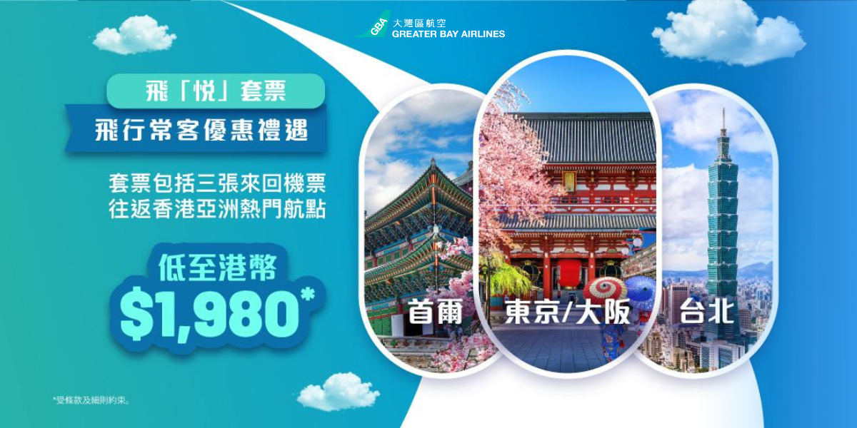 香港新聞網2月23日電 大灣區航空宣布,推出“飛‘悅’套票”優惠,由今年2月23日至6月30日止,可以最低1980元入手亞洲熱門航點的來回行程機票三套,並附送20公斤託運行李。大灣區航空是次優惠涉及的航點為台北、韓國首爾、日本東京、日本大阪。