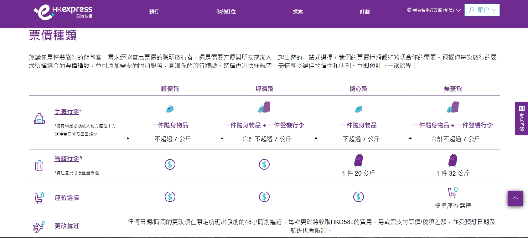 香港快運最新行李政策。(香港快運官網截圖) 當日,國泰航空行政總裁林紹波出席股東會時表示,香港快運屬於低成本航空,會參考亞洲區內同業做法和客戶需要,有關措施是回應客戶在沒有寄艙行李的情況下,對機票價格的期望。 他強調,國泰以雙品牌策略發展客運,未來會擴展以往香港旅客無法直飛的航點,下半年會陸續公佈。而集團在重建過程會繼續加入新投資,包括推出新商務艙及特選經濟艙,亦會持續提升貴賓室及機上餐飲娛樂服務。 林紹波表示,隨著供求逐步正常化,機票價格已按年不斷回落,預計今年將持續正常化和下降。集團已達成今季客運運力回復至疫情前80%的目標,明年首季全面恢復運力的目標進度非常理想,有信心能達標。(完) 【編輯:黃璇】