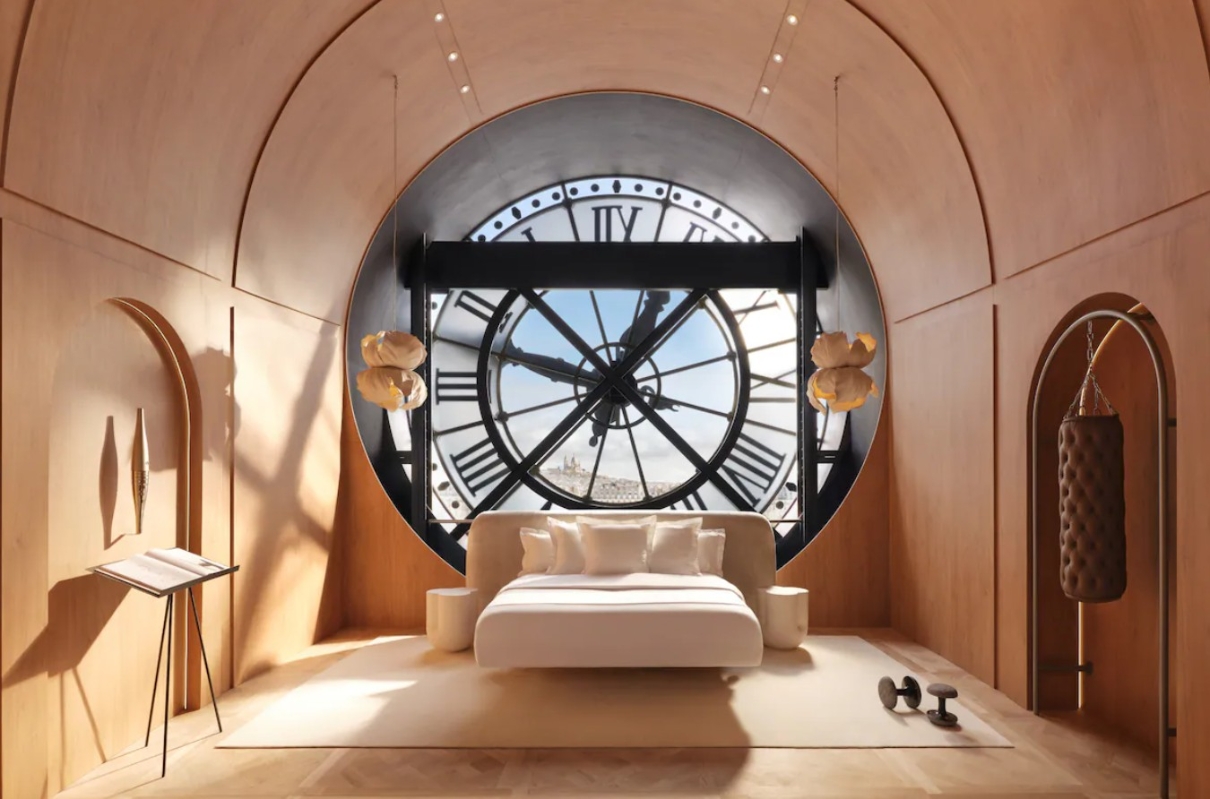 香港新聞網5月23日電 2024巴黎奧運開幕在即,為了迎接這個盛事,各種相關的活動也接連曝光。近日有一個值得遊客關注的消息:Airbnb與法國奧賽美術館(Musée d'Orsay,又稱奧賽博物館)合作,找來奧運聖火火炬的法國設計師Mathieu Lehanneur,改造獨具特色的鐘樓為客房,提供在開幕式上(7月26日)入住的機會,以獨特的視角觀看在塞納河上舉行的開幕式! 位於奧賽美術館頂樓的鐘錶室能透過獨特的視角俯視塞納河,也能拍出超現實感的照片,一直是旅遊巴黎的熱門景點,這次由設計奧運聖火火炬的國設計師Mathieu Lehanneur改造,以充滿溫暖希望的暖棕色與金色為主色,點綴乳白色的內裝,充滿線條感的家具陳列,打造出既浪漫又現代的奢華空間,也在房間內擺放了皮革沙袋、大理石啞鈴,以及陶瓷燈和奧運火炬製作的解說書,細節都在呼應著即將登場的巴黎奧運。