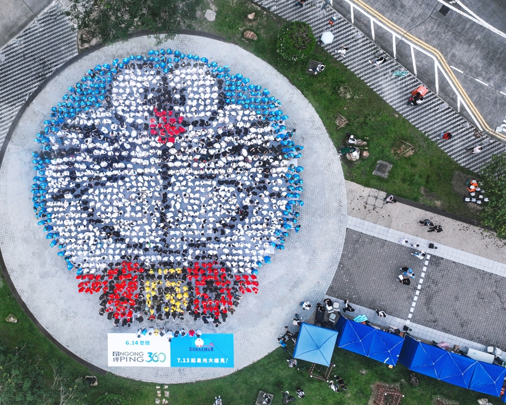 來自福建中學附屬學校、保良局林文燦英文小學、佛教林金殿紀念小學、東涌天主教學校和鄰舍輔導會近1,500名學生和義工,有序排列拼出展覽主題多啦A夢頭像。(圖片:昂坪360)
