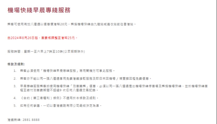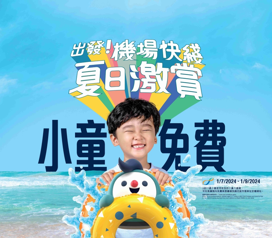 小童八達通免費乘搭暑假盡情出遊 機場快綫於今個暑假推出多項夏日激賞,讓一家大細、親朋好友可以開開心心出遊。由7月1日起至9月1日, 3至11歲小朋友憑有效小童八達通乘搭機場快綫,可享免費往 / 返市區車站(香港站、九龍站、青衣站)與機場站,方便一家大細遨遊世界。 機場快綫的士轉乘半價優惠推出 加倍優惠出行 機場快綫貼心照顧乘客需要,若接駁機場快綫前往機場的話,除可選乘港鐵享免費港鐵接駁服務外,亦可考慮乘搭的士前往機場快綫站,並享機場快綫的士轉乘優惠。由7月1日起至9月30日,乘客只需於入閘前,前往機場快綫香港站、九龍站或青衣站的客務中心出示港幣50元或以上之即日的士收據或憑證辦理手續,即享八達通車費半價優惠。每張的士收據或憑證最多可供5位乘客享此優惠。大家就不怕交通擠塞或遇上突發的路面情況問題,出行時間更易掌握。