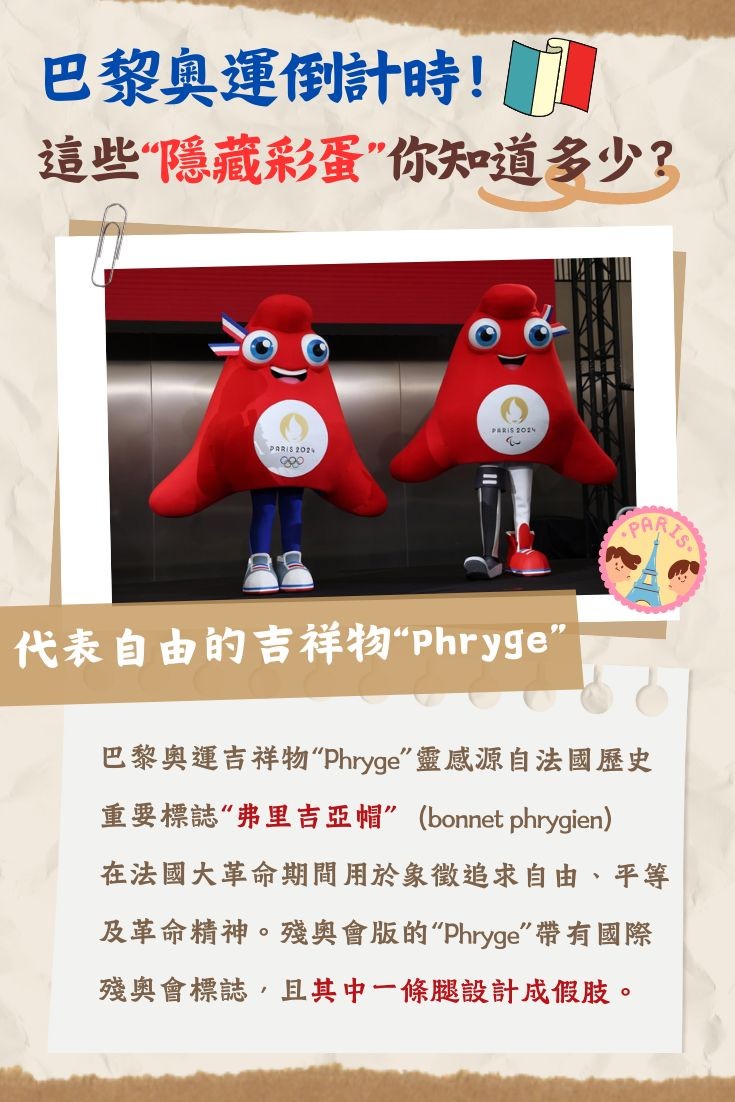 源自法國大革命的吉祥物“Phryge” 巴黎奧運吉祥物“Phryge”,靈感源自法國歷史重要標誌“弗里吉亞帽”(bonnet phrygien),最初是希臘及羅馬解放奴隸的服飾,之後在法國大革命期間用於象徵追求自由、平等及革命精神,有“自由之帽”的別稱。奧運會及殘奧會使用同一個吉祥物形象,奧運會版Phryge的下方是五環標誌;殘奧會版Phryge則是國際殘奧會標誌,而其中一條腿設計成假肢。