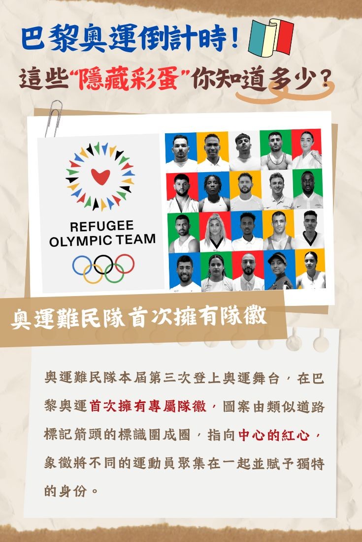 奧運難民隊首次擁有隊徽 奧運難民隊於2016年成立,在里約奧運首次亮相,本屆第三次登上奧運舞台。36位運動員來自11個不同國家,代表全球超過1億流離失所的難民群體,出戰12個比賽項目。他們不為任何國家而戰,亦不會預測獎牌數及成績。在巴黎奧運首次擁有專屬隊徽,圖案由類似道路標記箭頭的標識圍成圈,指向中心的紅心,象徵將不同的運動員聚集在一起並賦予獨特的身份。