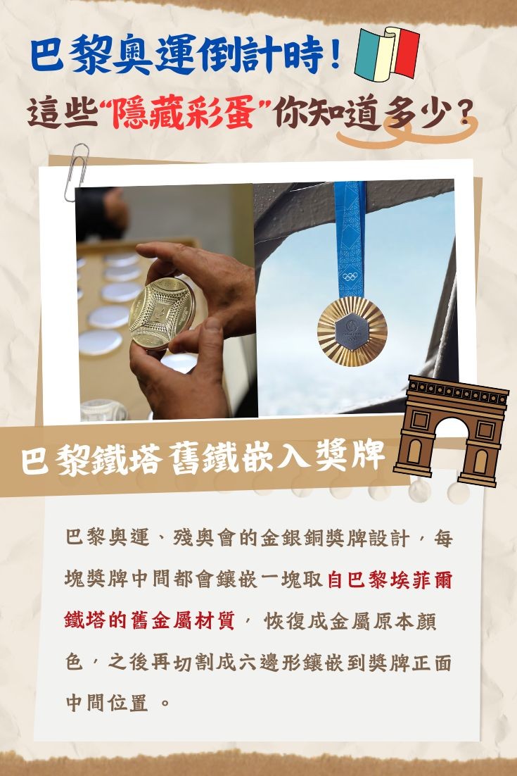 巴黎鐵塔舊鐵嵌入獎牌 巴黎奧運、殘奧會的金銀銅獎牌設計,每塊獎牌中間都會鑲嵌一塊取自巴黎埃菲爾鐵塔的舊金屬材質,經去除表面油漆後,恢復成金屬原本顏色,之後再切割成六邊形鑲嵌到獎牌正面中間位置。