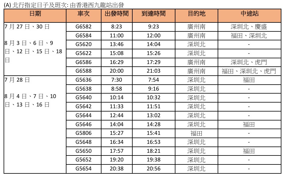 北行指定日子及班次:由香港西九龍站出發。