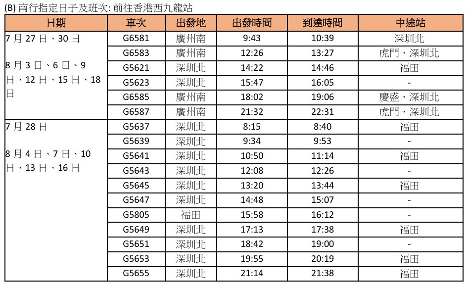 南行指定日子及班次:前往香港西九龍站。 【編輯:黃璇】