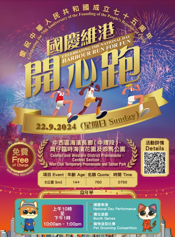 香港新聞網8月7日電 為慶祝中華人民共和國成立75周年,康樂及文化事務署(康文署)將於9月22日主辦“國慶維港開心跑”,鼓勵市民穿着華服或配合國慶元素的服裝一起參與,歡度國慶。 “國慶維港開心跑”將於9月22日上午在中西區海濱長廊(中環段)及灣仔臨時海濱花園一帶舉行5公里項目,名額設有750個,參加者的年齡須為14歲或以上,報名費用全免。市民可於8月8日上午8時30分起經SmartPLAY流動應用程式(My SmartPLAY App)、或智能自助服務站報名,名額先到先得,額滿即止。