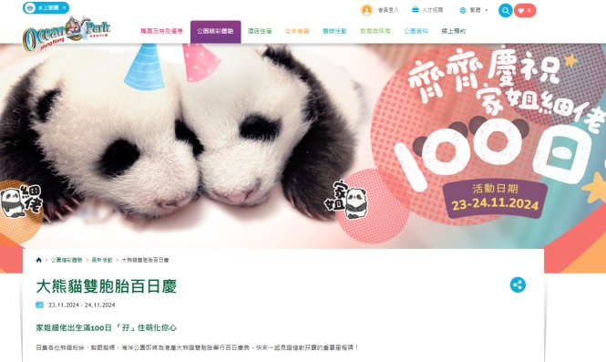 香港新聞網11月8日電 香港海洋公園宣布,因大熊貓“盈盈”生下的龍鳳胎寶寶即將迎來誕生百日,特定於11月23日和24日舉辦慶典派對。活動內容豐富,包括向遊客免費派發紅雞蛋和豬腳薑醋,以及“威威劇場”的每日兩場實時直播,遊客可以近距離觀察這對可愛大熊貓寶寶的生活狀態。 在暫停開放三個月後,大熊貓展館“熊貓之旅”將於11月23日重新開放,開放時間為每天上午10時至下午3時。屆時,寶寶的父親大熊貓“樂樂”也將結束“侍產假”,與公眾見面。海洋公園預測,這對大熊貓寶寶將於明年2月與市民和遊客正式見面。 慶典活動將融入中國傳統習俗,海洋公園將在23日和24日上午10時,在正門入口及“自然生態徑”附近向入場遊客派發限量的紅雞蛋和豬腳薑醋,分享雙胞胎寶寶出生百日的喜悅。同時,夢幻水都平台將被打造成最受歡迎的打卡地點,遊客可以與大熊貓主題背景合影留念,記錄快樂時光。