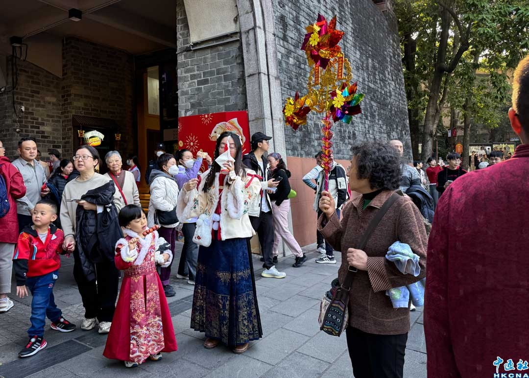 明城牆下,穿著漢服的小孩吃著冰糖葫蘆,老人家拿著風車行大運,年味撲面而來