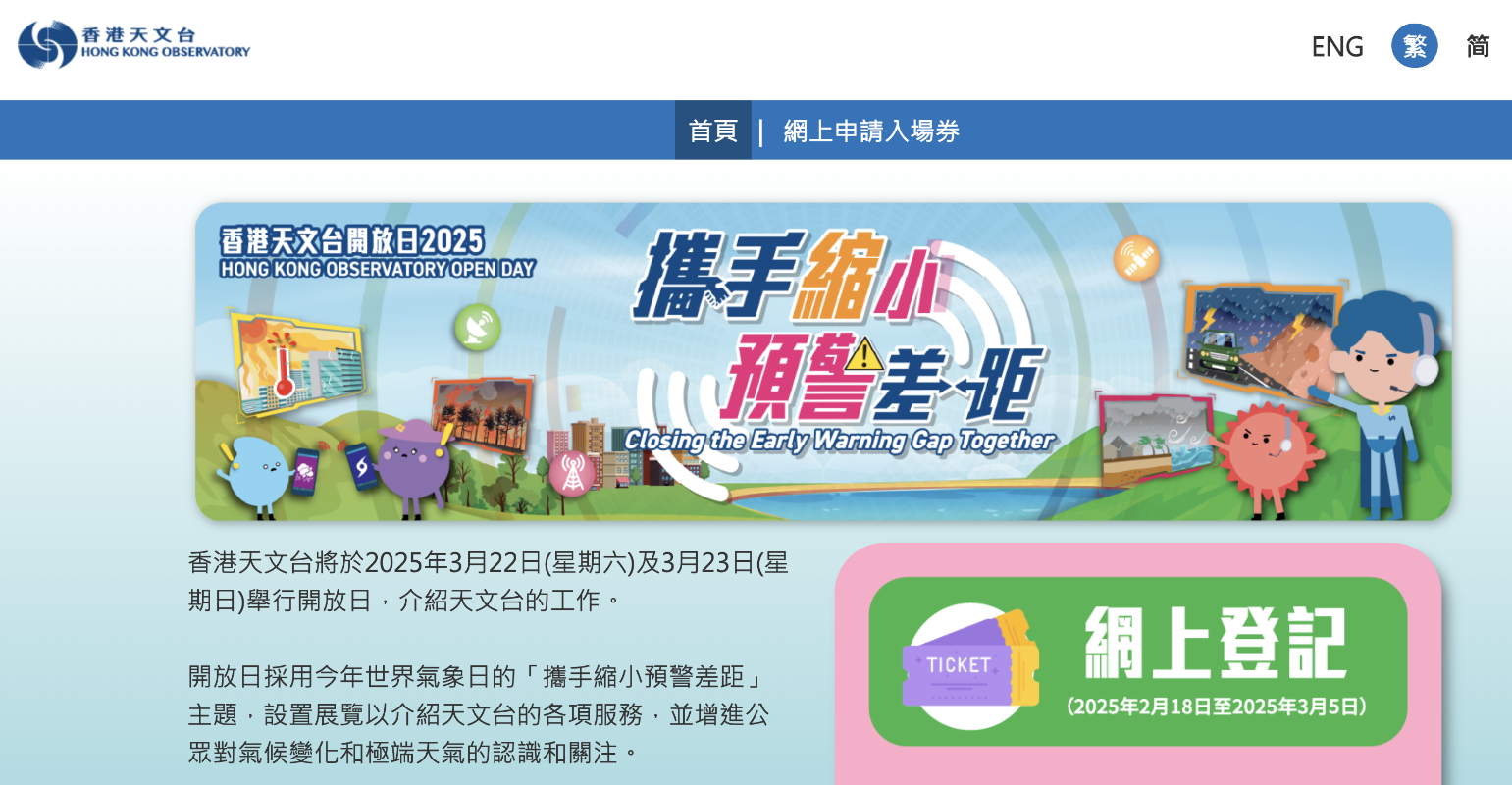 香港天文台將於3月22和23日舉行開放日。 參加開放日的市民須預先作網上登記,每人最多可索取四張入場券,費用全免。如報名人數超出限額,將以電腦抽籤形式處理。登記系統(www.hkoopenday.gov.hk/tc/registration)由即日起至3月5日中午12時開放,成功獲取入場券人士會於3月12日或之前經電郵收到二維碼入場券。 開放日詳情如下: 地點:香港天文台總部(九龍彌敦道134A號) 日期:3月22日和23日(星期六和星期日) 時間:上午9時30分至下午5時 注: 每節參觀時間約1小時 開放日詳情,可瀏覽天文台網頁:www.hkoopenday.gov.hk/tc/registration。(完) 【編輯:黃璇】