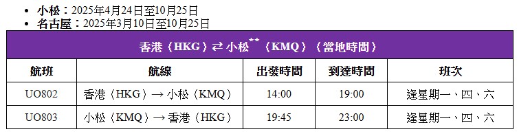香港快運航空由4月24日起,將推出香港唯一直飛石川縣小松機場的全新航線。 為慶祝開啟全新的小松航線,香港快運推出限時優惠,小松及名古屋“經濟飛”單程票價低至港幣208元*(包括一件隨身物品及一件登機行李)。於3月3日下午2時00分至3月4日晚上11時45分期間登入香港快運官網或使用手機應用程式預訂兩大航點的優惠機票,盡情去飛,享受北陸的無限魅力。各航點旅遊日期如下: 小松:2025年4月24日至10月25日 名古屋:2025年3月10日至10月25日