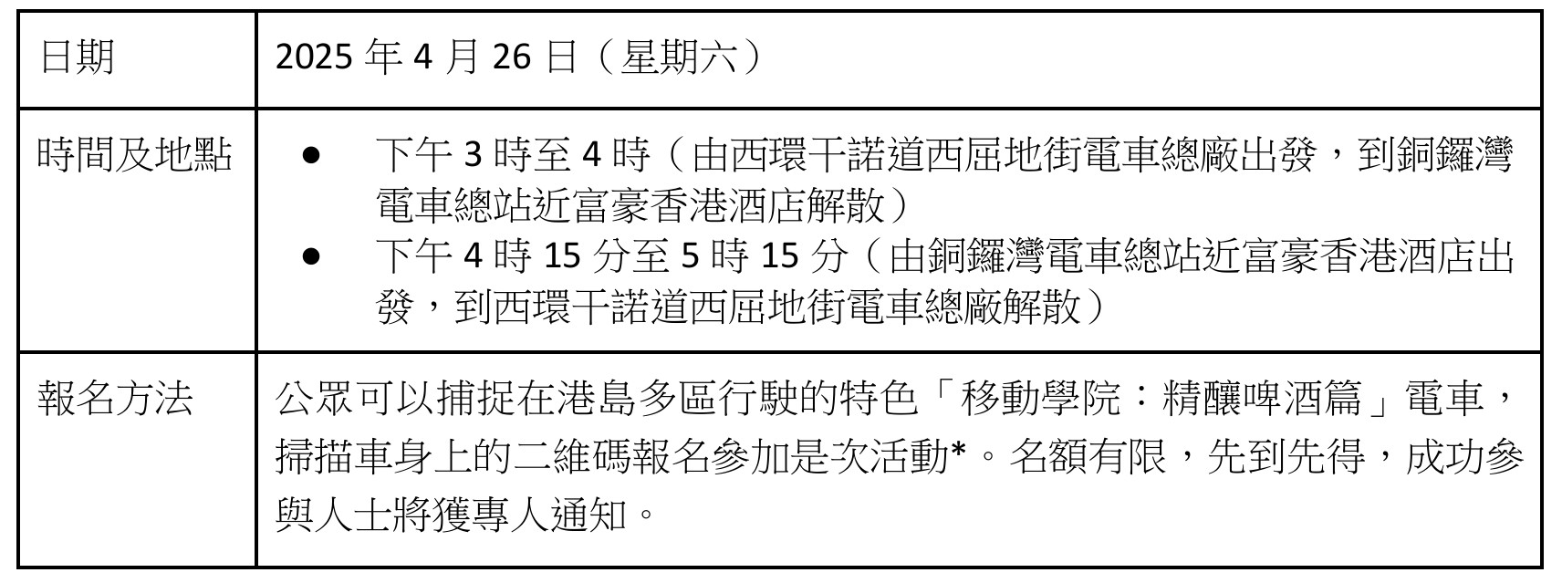 活動詳情。 首個“移動學院:精釀啤酒篇”活動將於4月26日下午舉行,名額共20個,免費參與,每個名額可攜同一位親友參加。主辦機構同時推出線上線下廣告互動,公眾可以捕捉在港島多區行駛的特色“移動學院:精釀啤酒篇”電車,掃描車身上的二維碼報名參加是次活動。名額有限,先到先得,成功參與人士將獲專人通知。(完) 【編輯:黃璇】