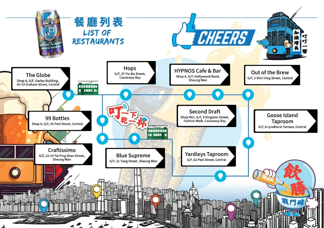 香港電車沿線的精釀地圖。 在一小時的電車旅程,乘客可享用由Black Kite Brewery、Breer HK、Carbon Brews、Deadman Brewery、hEROES Beer Co、H.K. Lovecraft及Yardley Brothers釀製的創新口味精釀。