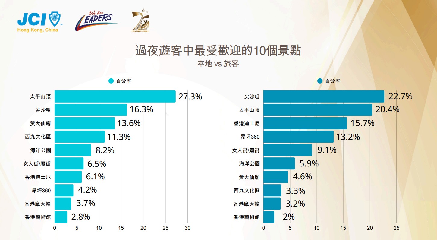 調查顯示過夜遊客中最受歡迎的10個景點。(圖源:JCIHK)