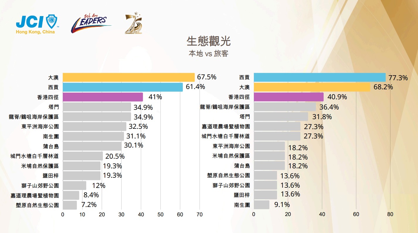 在生態觀光景點選擇上,本地人與海外遊客的首三位選擇均為西貢、大澳、香港四徑。(圖源:JCIHK)