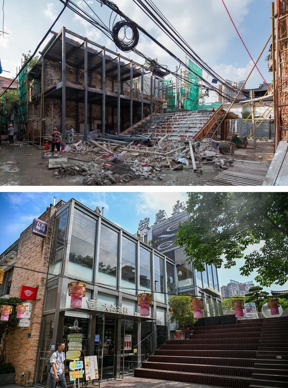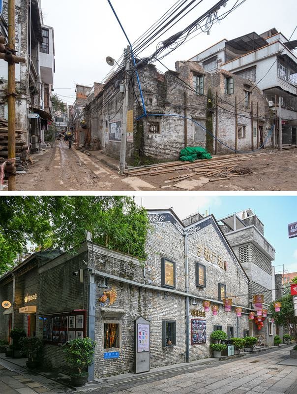 •   這是一張拼版照片:上圖為改造前的永慶大街(資料照片,新華社發);下圖為2025年5月13日拍攝的永慶坊永慶大街(新華社記者陳朔攝)。 廣州永慶坊位於荔灣區恩寧路,保存著廣州最為完整的騎樓建築群,是一條有著千年曆史的文化街區。2016年,永慶坊率先成為全國“微改造”試點街區,摒棄了大拆大建的做法,通過“綉花功夫”延續歷史格局,活化利用舊建築空間,既留存嶺南建築風貌,又創新性融入現代生活功能,實現傳統肌理保護與人居環境提升的有機統一。 如今,永慶坊以非遺文化為核心,打造了廣州首個非遺主題街區,通過業態升級煥發傳統街巷生機。市民與遊客時常駐足於此,感受接地氣的老廣州味道,在城市變遷中留住鄉愁。圖片來源:新華社