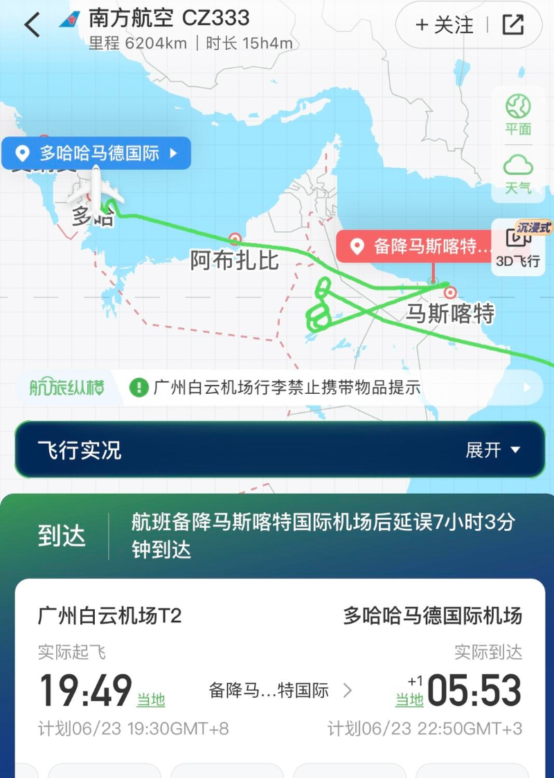 CZ333航班飛行路線(圖源:航旅縱橫) 此外,23日廣州飛往迪拜的航班未受影響。 當地時間23日夜間,卡塔爾首都多哈傳出爆炸聲。 此前,卡塔爾外交部23日發表聲明說,出於對本國公民、居民及來訪者安全的高度重視,卡塔爾相關部門宣布,根據本地區最新局勢發展,作為一系列預防性措施的一部分,決定暫停本國領空內的航空活動。 聲明說,卡塔爾官方機構正密切、持續地監測事態進展,並與地區及國際夥伴協調評估局勢,有關信息將通過官方渠道及時向公眾發布。 另據央視新聞,當地時間6月23日晚,卡塔爾宣布重新開放因伊朗導彈襲擊暫時關閉的領空。(完) 【編輯:淩玉輝】