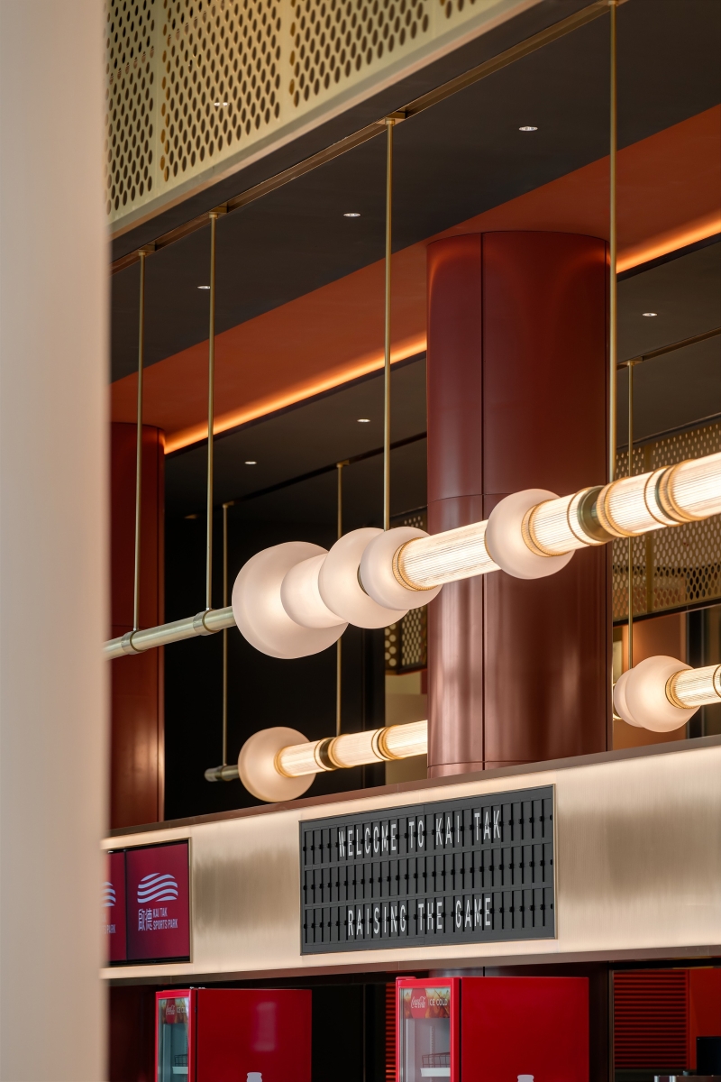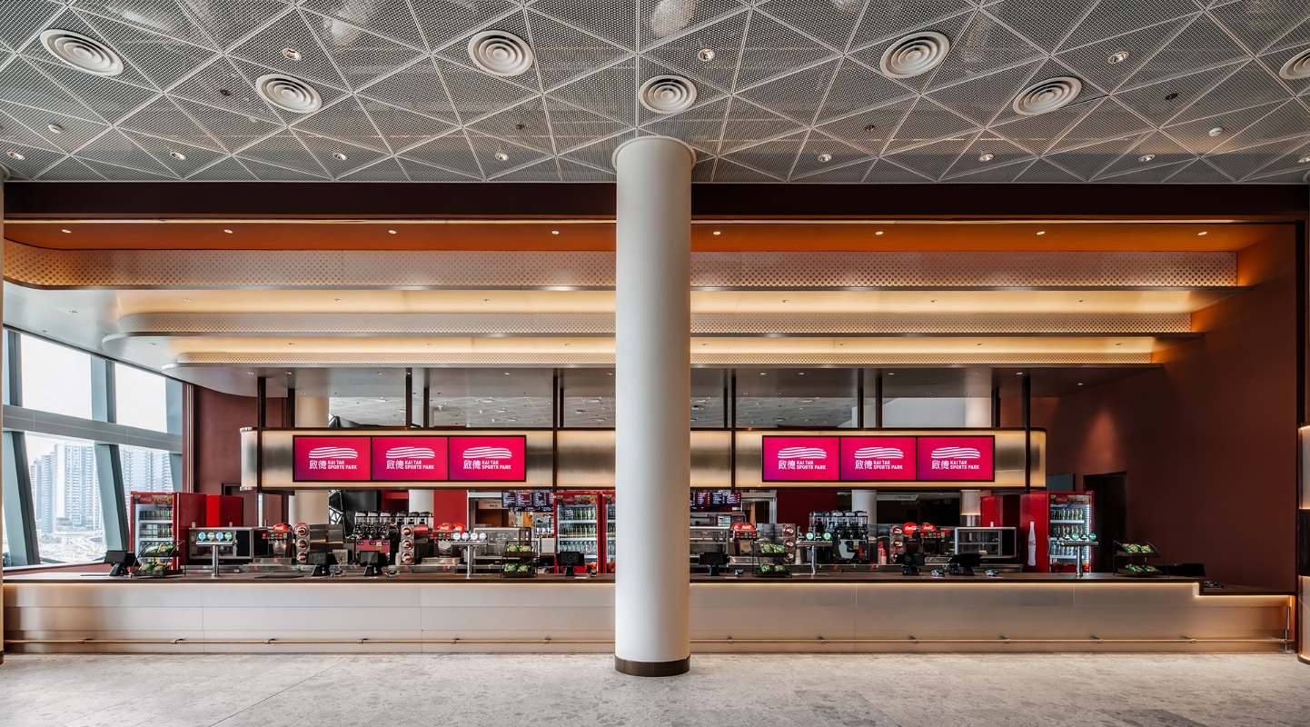“Loong”酒吧以青銅色調象徵銅牌榮耀。 “Loong”及“White Tiger”於三樓南看台的左右兩側延伸,背靠巨幅玻璃幕牆,俯瞰維多利亞港的壯麗天際線。酒吧以青銅色調象徵銅牌榮耀,將機場跑道指示燈系統昇華為空間燈光美學。設計團隊將跑道指示燈解構重組,頂部半透明樹脂板內嵌LED陣列,當左右兩邊酒吧燈光同時亮起,從南看台對面眺望維港,宛如置身飛機內,循著跑道燈光指引啟程。 值機敘事:從航空到餐飲的符號轉譯 分佈於主場館二樓及五樓的標準餐飲區與酒吧,將機場登機流程轉譯為餐飲體驗,登記櫃台被重新設計為餐品點單與取餐窗口。餐飲區採用橘紅色調,營造愉悅氛圍並激發食慾;酒吧則以深灰色為主調,呈現如機艙般的冷峻與未來感,金屬飾面搭配LED光帶,構建出冷酷感十足的環境。這一設計不僅重現了啟德機場離境大堂的繁忙節奏,更喚醒港人對客運大樓的集體記憶。 梁志天設計集團設計董事陳恆恩表示:“能夠參與香港這一地標項目,我和團隊深感榮幸。在為期兩年的設計旅程中,我們特意從前啟德機場的經典元素中汲取靈感,將其融入空間設計中。對我們而言,‘啟德’不僅是一座機場,更是承載著整座城市的集體回憶。我們希望這些熟悉的航空元素能喚起訪客的珍貴回憶,讓大家帶著這份情感連結,共同迎接啟德體育園的全新篇章,延續屬於香港的傳奇故事。”(完) 【編輯:黃璇】