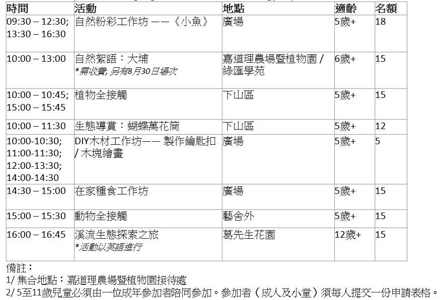 響應全國生態日 嘉道理農場8月15日免費入場 舉辦導賞及工作坊香港新聞網7月31日電 為響應全國生態日,嘉道理農場暨植物園將於8月15日免費入場,並舉辦一系列免費生態活動,誠邀公眾親臨園區認識自然生態,藉此提高對環境保護和可持續發展的關注。活動報名連結按此。