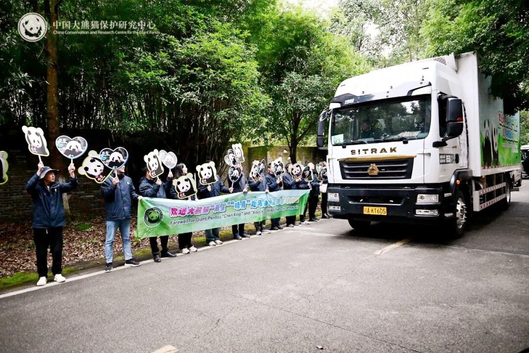 根據中國駐馬大使館在臉書發佈的照片,兩隻大熊貓乘坐專屬的中國重汽HOWO輕卡“國寶運輸車”,在工作人員的嚴密護送下離開大熊貓保護研究中心。