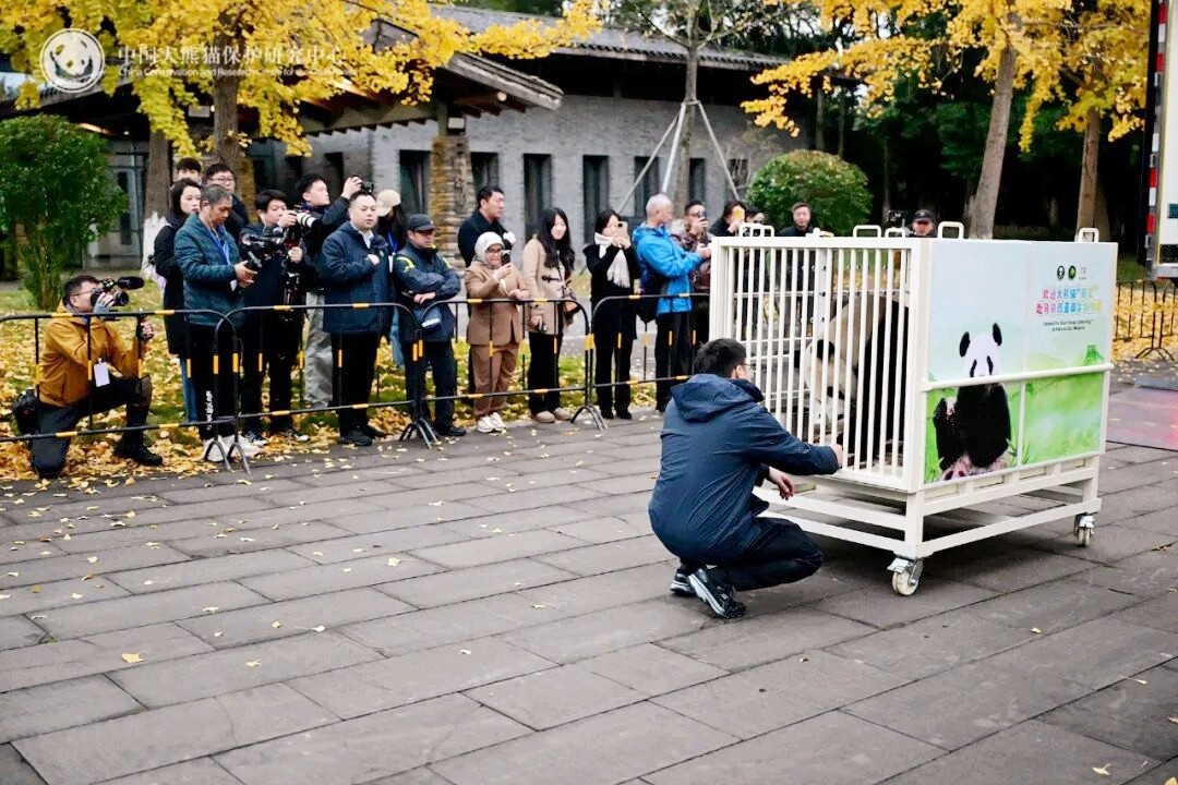 中國兩隻大熊貓“辰星”和“曉月”11月18日乘坐運輸車從四川都江堰基地出發前往機場。圖自中國大熊貓保護研究中心