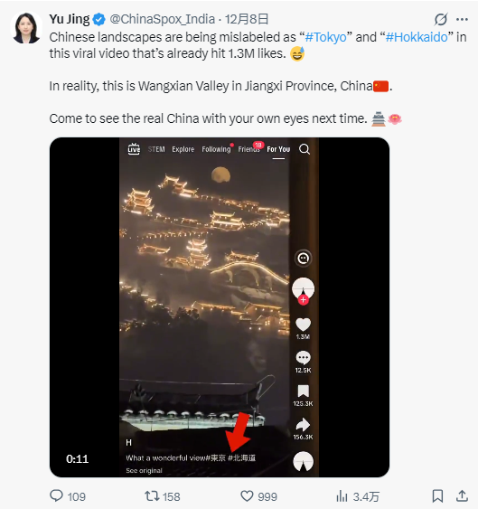 近日,一段關於中國江西上饒望仙谷美景的視頻在外網爆火,但有賬號卻將其標註為日本“東京”和“北海道”,暗示該視頻是在日本拍攝,引發網民質疑與糾正。隨後,中國駐印度大使館發言人宇靜在社交平台X上發帖稱,該熱門視頻已獲得130萬點讚,其中風景被錯誤標注為東京和北海道。實際上,這是中國江西望仙谷。“請你們親自來中國,看看真正的中國吧。”