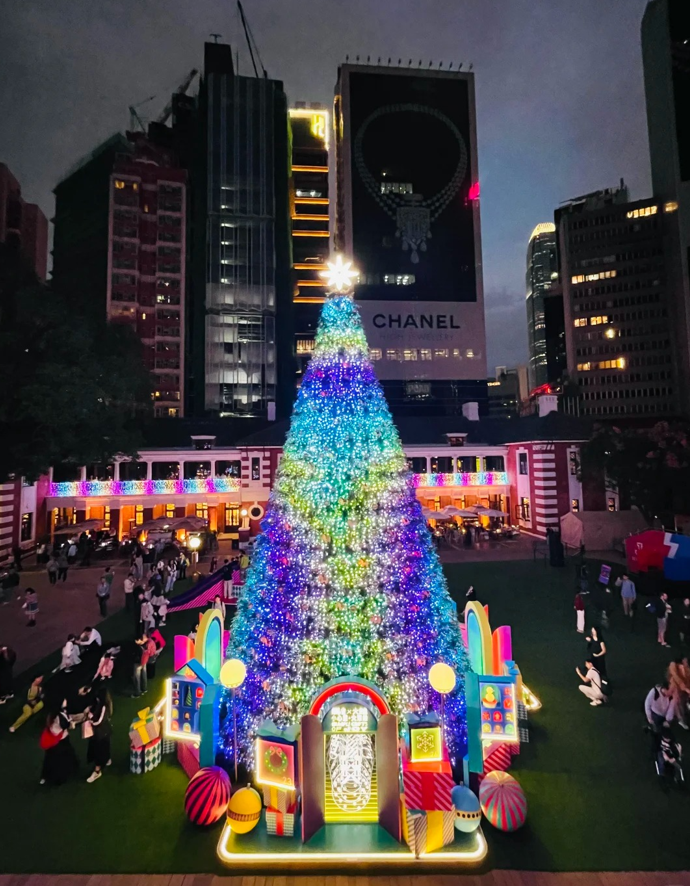 中環大館12米高聖誕樹在歷史建築間閃耀生輝。(香港中通社記者 黃璇攝) 位於中環荷李活道10號,昔日中區警署(現為大館)化身節日天堂,12米高聖誕樹在歷史建築間閃耀生輝。現場有世界級現代馬戲表演、懷舊遊樂設施和聖誕頌歌,燈光於夜色下在外牆跳躍,為節日增添夢幻氛圍。 香港半島酒店