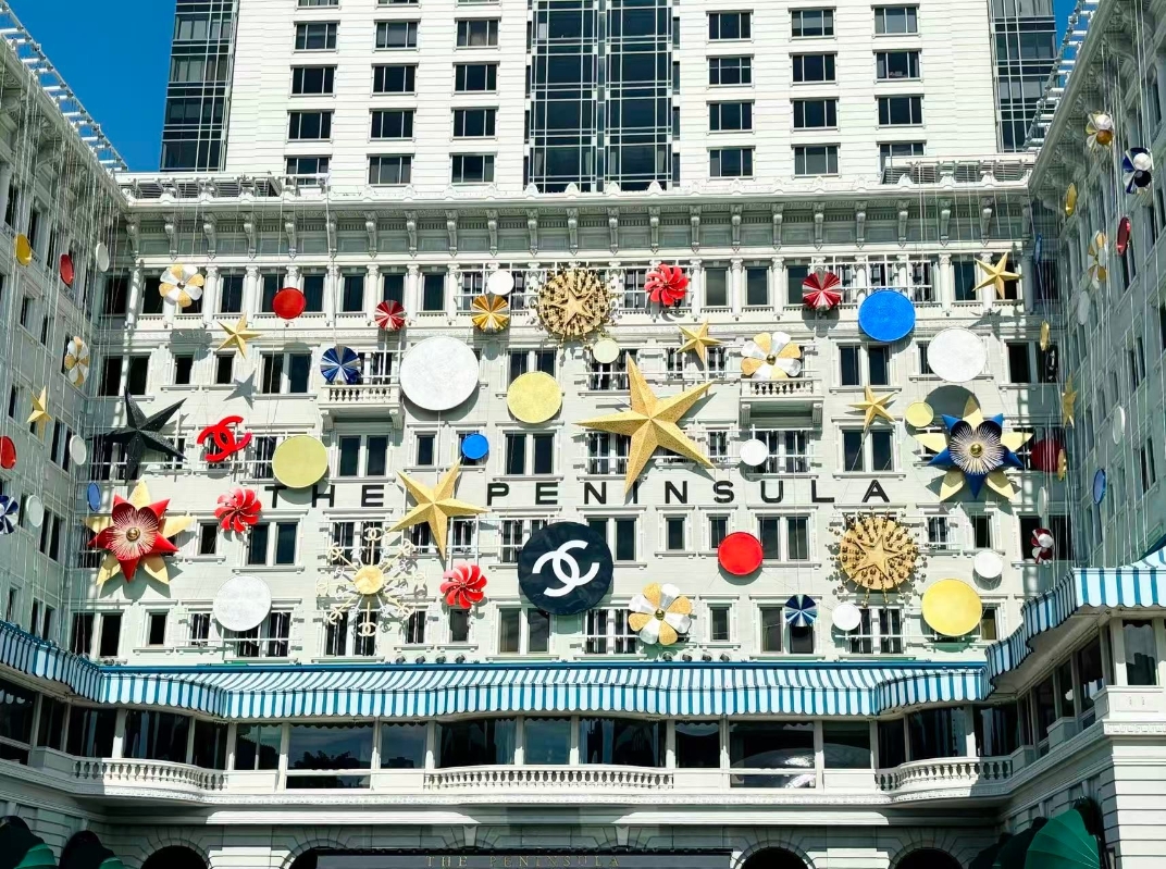 香港半島酒店第五年與CHANEL合作於外墻展示聖誕裝飾。(香港中通社記者 黃璇攝) 位於九龍尖沙咀梳士巴利道的香港半島酒店第五年與CHANEL合作,成為全球首批採用全新設計的酒店之一。外牆以星空和CHANEL經典圖案作主題,璀璨奪目,是聖誕打卡熱點。每一盞燈光都訴說著聖誕的奇幻故事,帶來無限浪漫。 利東街聖誕燈飾