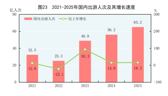 圖源:中國國家統計局 公報顯示,2025年中國國內出游65.2億人次,比上年增長16.2%。其中,城鎮居民國內出游50.0億人次,增長14.3%;農村居民國內出游15.3億人次,增長22.6%。國內遊客出游總花費63003億元,增長9.5%。其中,城鎮居民出游花費52990億元,增長7.5%;農村居民出游花費10012億元,增長21.4%。