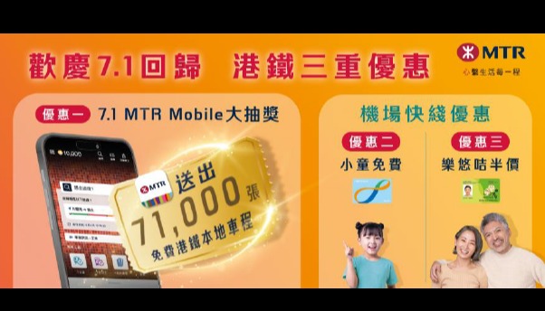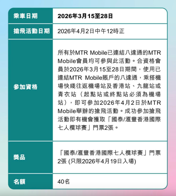 搭機場快綫有機會贏七欖決賽日門票 由2026年3月15日至28日,合資格MTR Mobile會員只需使用已連結至帳戶的八達通,乘搭機場快綫往返機場站及香港站、九龍站或青衣站(起點或終點須為機場站)一次,即可參加4月2日中午12時於MTR Mobile內舉行的搶飛活動。成功搶票者可獲香港國際七人欖球賽4月19日決賽日門票一套(2張),名額共40套,先到先得。